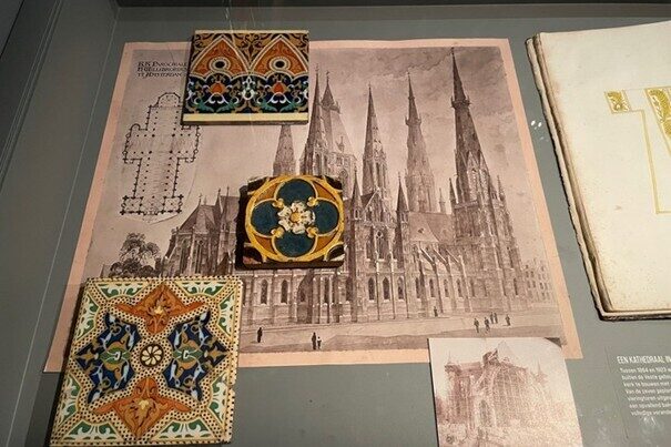 In de ruimte ‘Kerken’ in het Cuypershuis zijn de vloertegels te zien. Nog meer decoraties uit dezelfde kerk hangen in de tentoonstelling De Golvende Lijn.