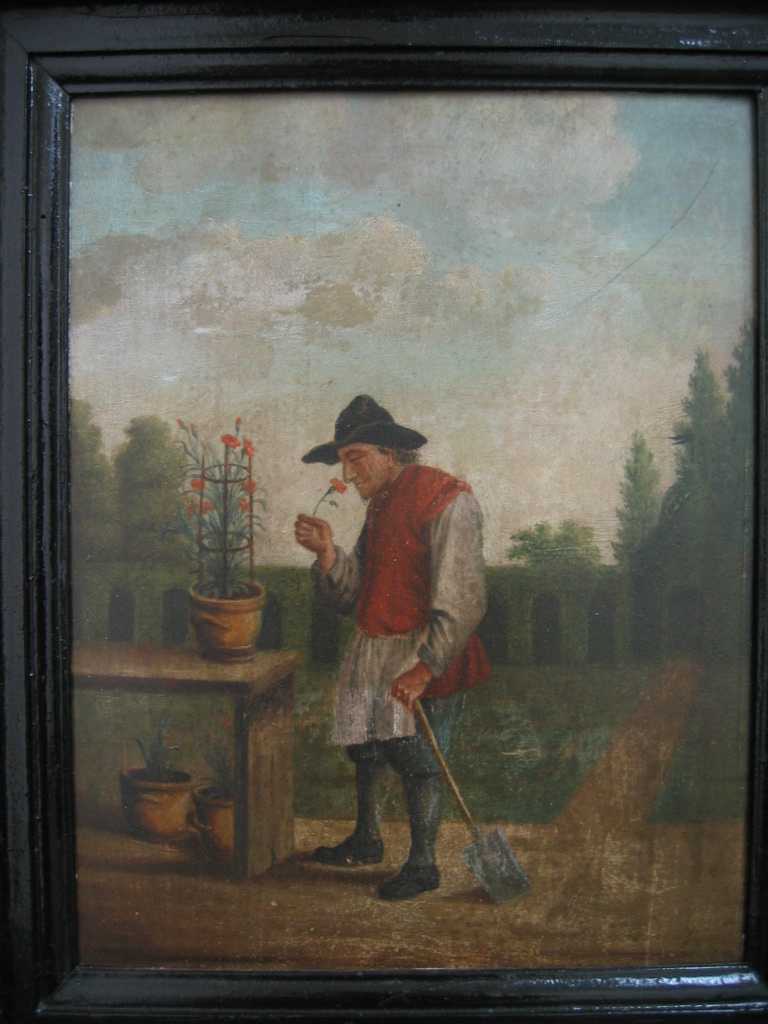 Op het schilderij staat een tuinman met zijn schep. Hij ruikt aan een bloem die hij zojuist geplukt heeft. Het werk is niet gesigneerd en is vanaf het begin van het museum in 1932 in de collectie opgenomen als een schenking van de familie Cuypers. In de registratie staat dat het werk is gemaakt door Johannes Hubertus Cuypers, geïnspireerd op een oude prent. Helaas staat er niet bij om welke prent het hier gaat. Er zijn nog vier soortgelijke schilderijen in de collectie, in een serie van in totaal vijf.