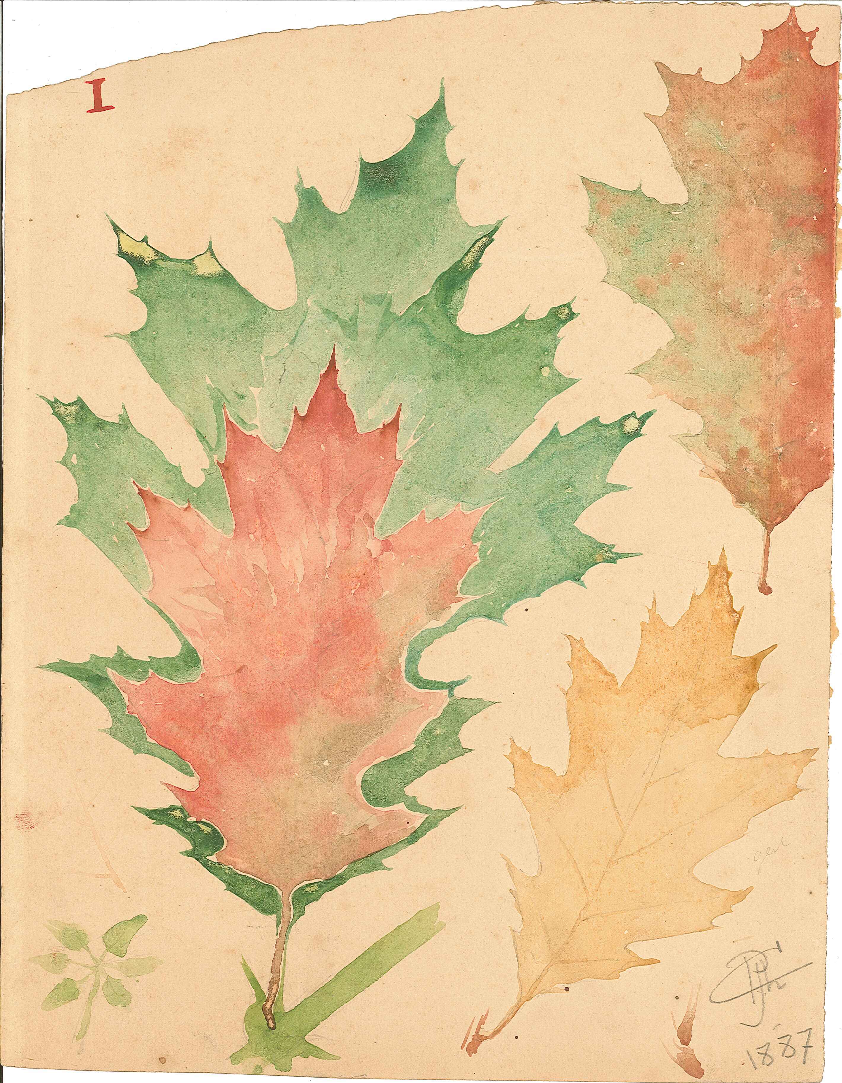 Op Cuypers’ werktafel in de ruimte ‘Inspiratie’ liggen een paar van zijn schetsen. In 1887 tekent hij op een schetsblad een aantal symmetrische bladmotieven in verschillende kleuren. Op een ander stuk papier combineert hij tekeningetjes van bladeren en takjes met al wat meer uitgewerkte schetsen voor randversieringen. Beide tekeningen zijn door hem gesigneerd. Het zijn voorbeelden van de indrukwekkende hoeveelheid schetsen die Cuypers maakte.